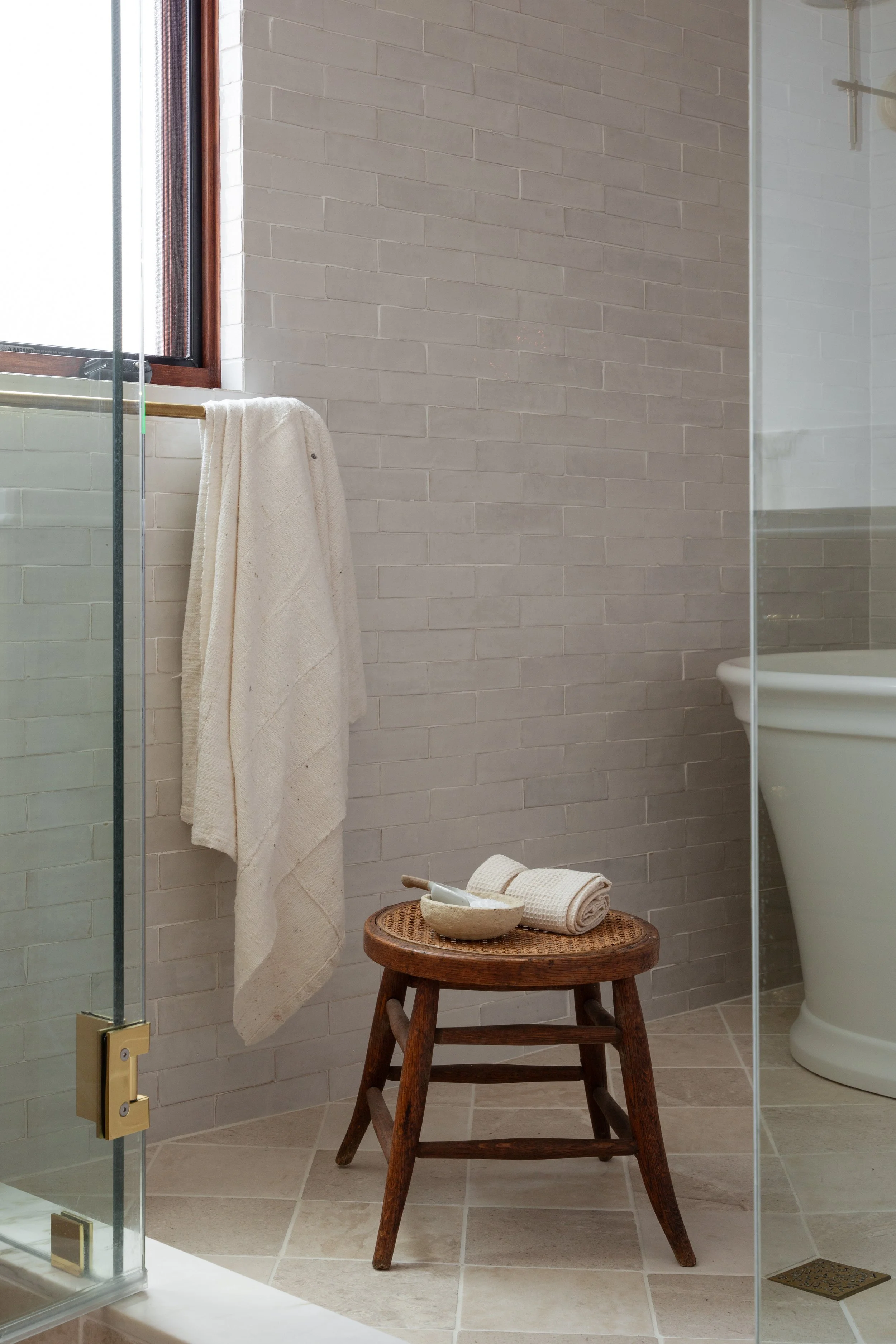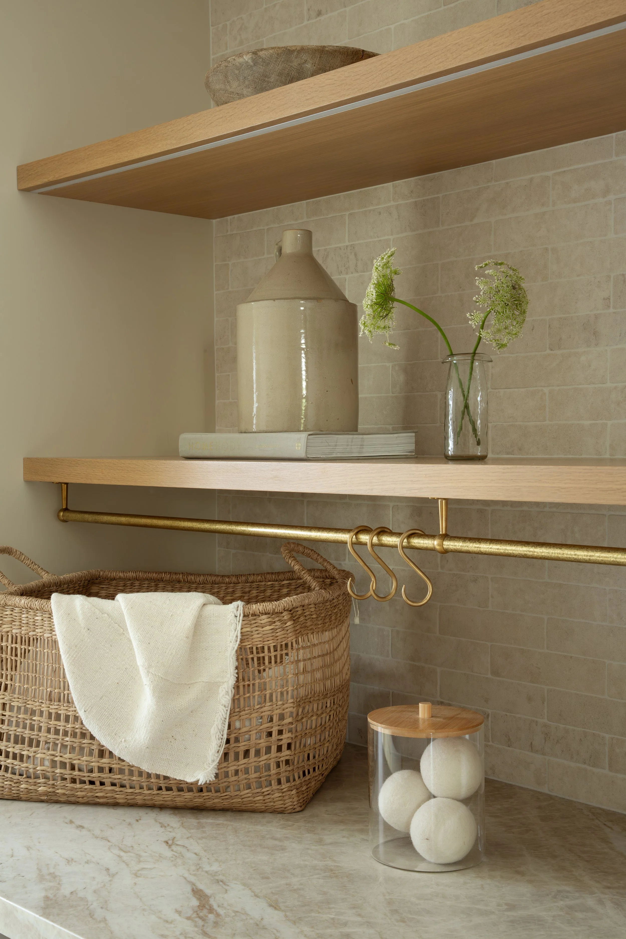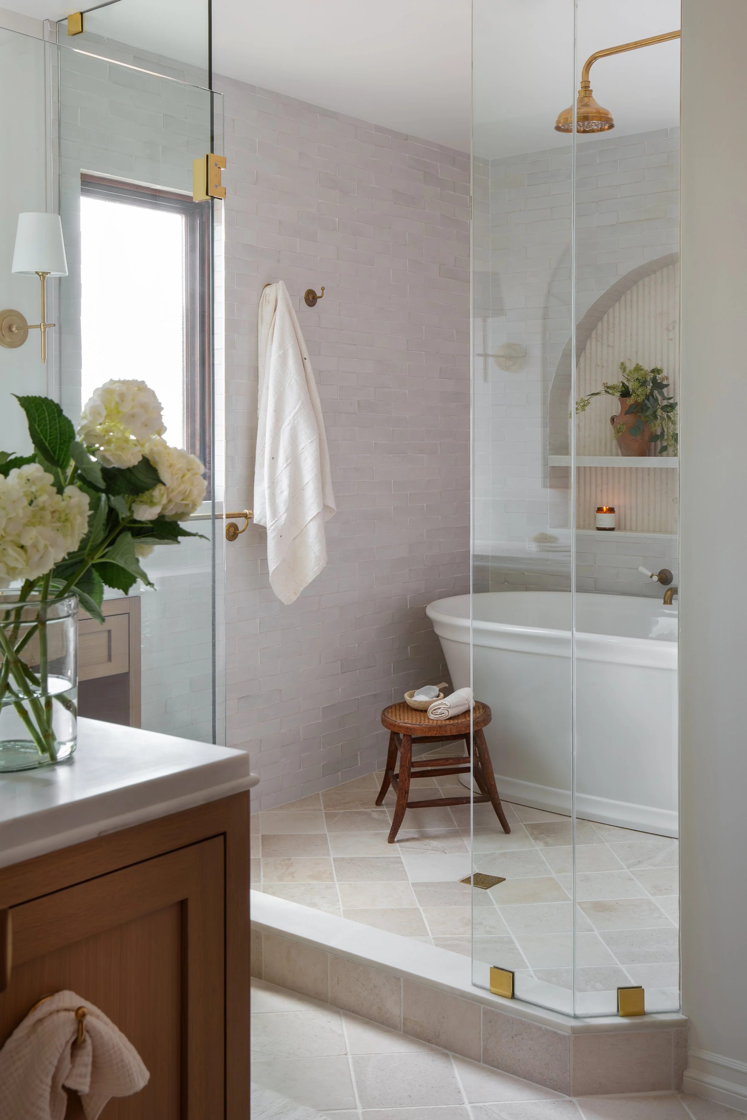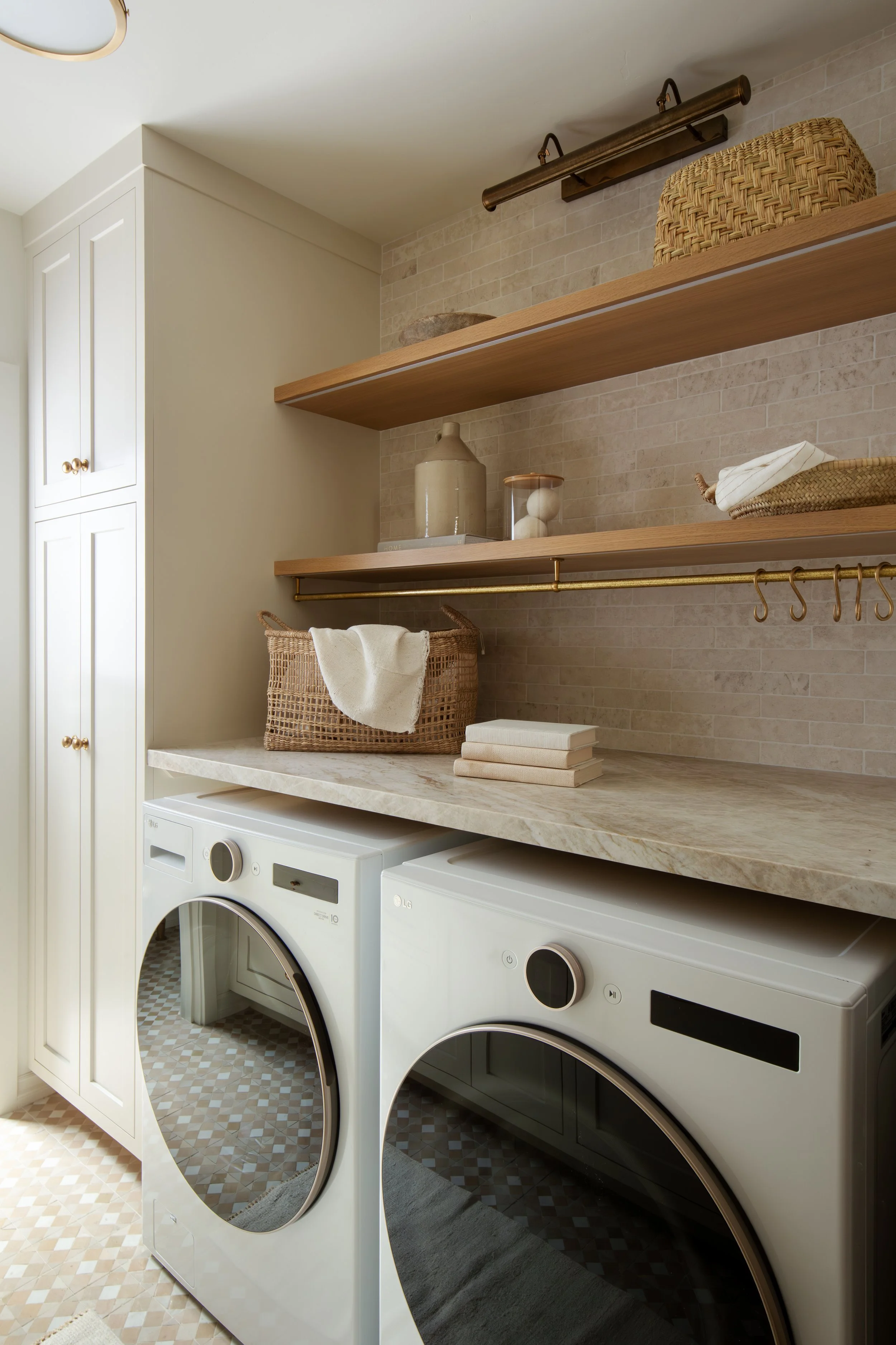 Every inch of this project reflects an appreciation for antique finishes, natural materials, and artisanal touches. We created a serene and functional laundry room, a charming powder bath, and a stunning master suite bath that celebrates both beauty and purpose. From hand-wrought brass fixtures to layered stone and custom cabinetry, the design balances old world character with refined modern comfort.